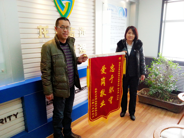 2015年1月份,一位八十多歲高齡的老人到張家口市商業(yè)銀行某支行辦理取錢業(yè)務(wù)時(shí),因老人年事已高患有老年病,與銀行的工作人員發(fā)生了沖突,無論工作人員如何解釋,仍無法溝通,至此,老人經(jīng)常到該行找工作人員滋事,老人的行為嚴(yán)重影響到支行的正常業(yè)務(wù),為客戶辦理業(yè)務(wù)帶來了不便,為維護(hù)好銀行正常秩序,我公司派駐支行的保安隊(duì)員顧龍液、王文來,主動接近老人進(jìn)行勸阻,交流溝通,問寒問暖,緩解老人心態(tài)。之后我公司曹文平隊(duì)長得知此事,也趕到支行協(xié)助處理,幫忙找到了老人的家人,在家人的勸說下,老人離開了支行,支行恢復(fù)了正常的工作秩序。經(jīng)過此事,我公司保安大隊(duì)長曹文平及派駐到張家口市商業(yè)銀行的保安隊(duì)員顧龍液、王文來受到了張家口市商業(yè)銀行支行領(lǐng)導(dǎo)的高度贊揚(yáng),特到我公司送來了錦旗與表揚(yáng)信,對我公司進(jìn)行感謝。
