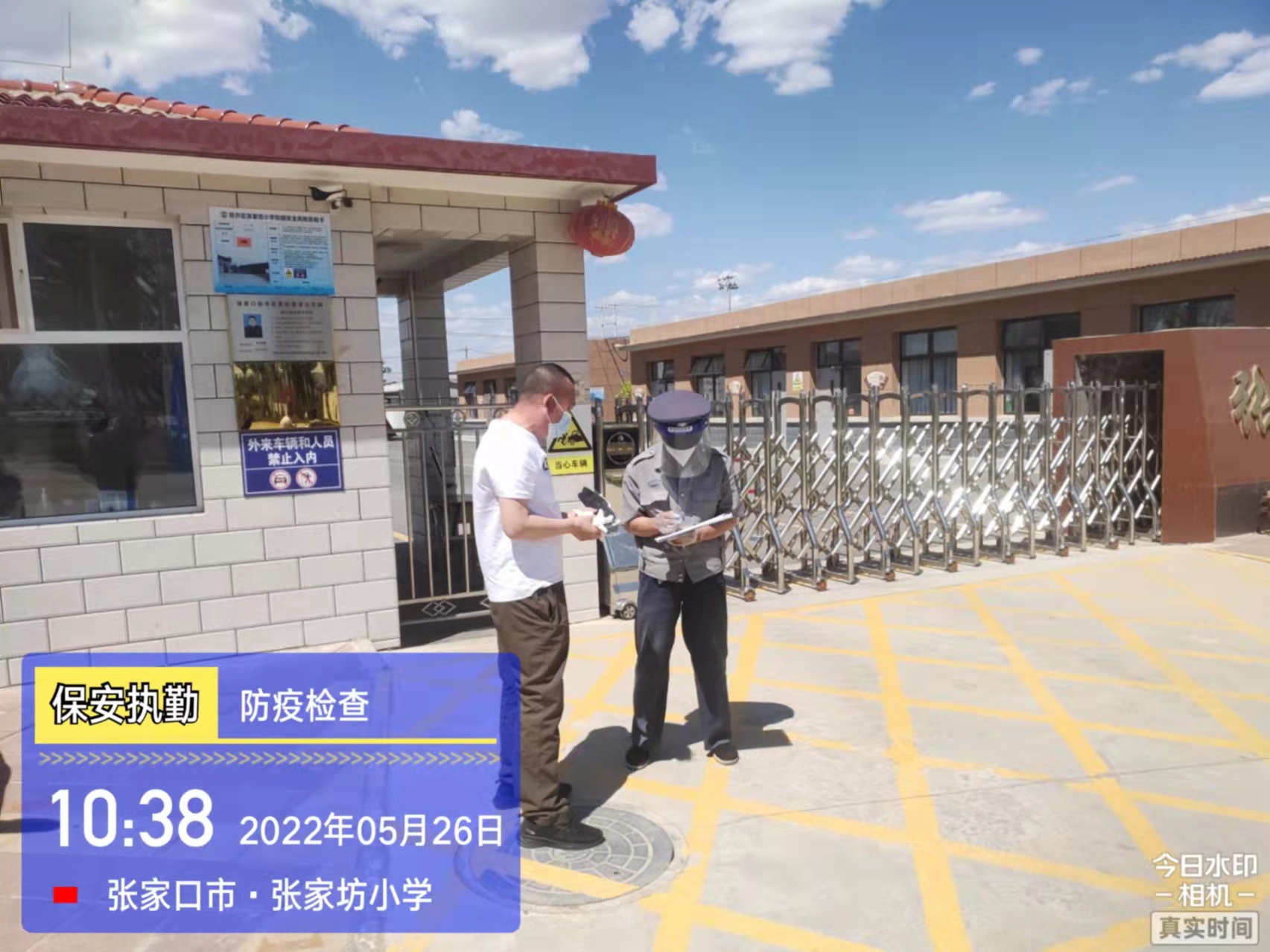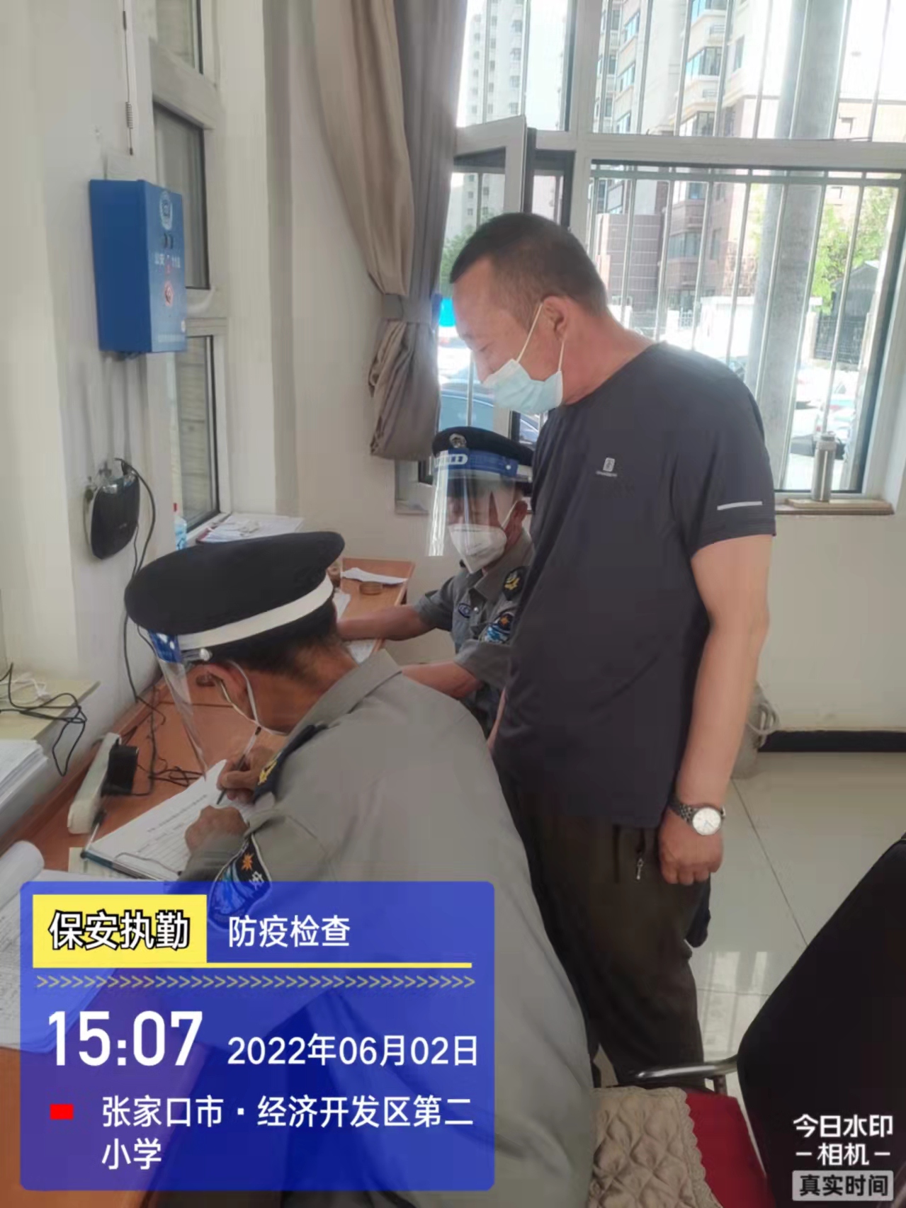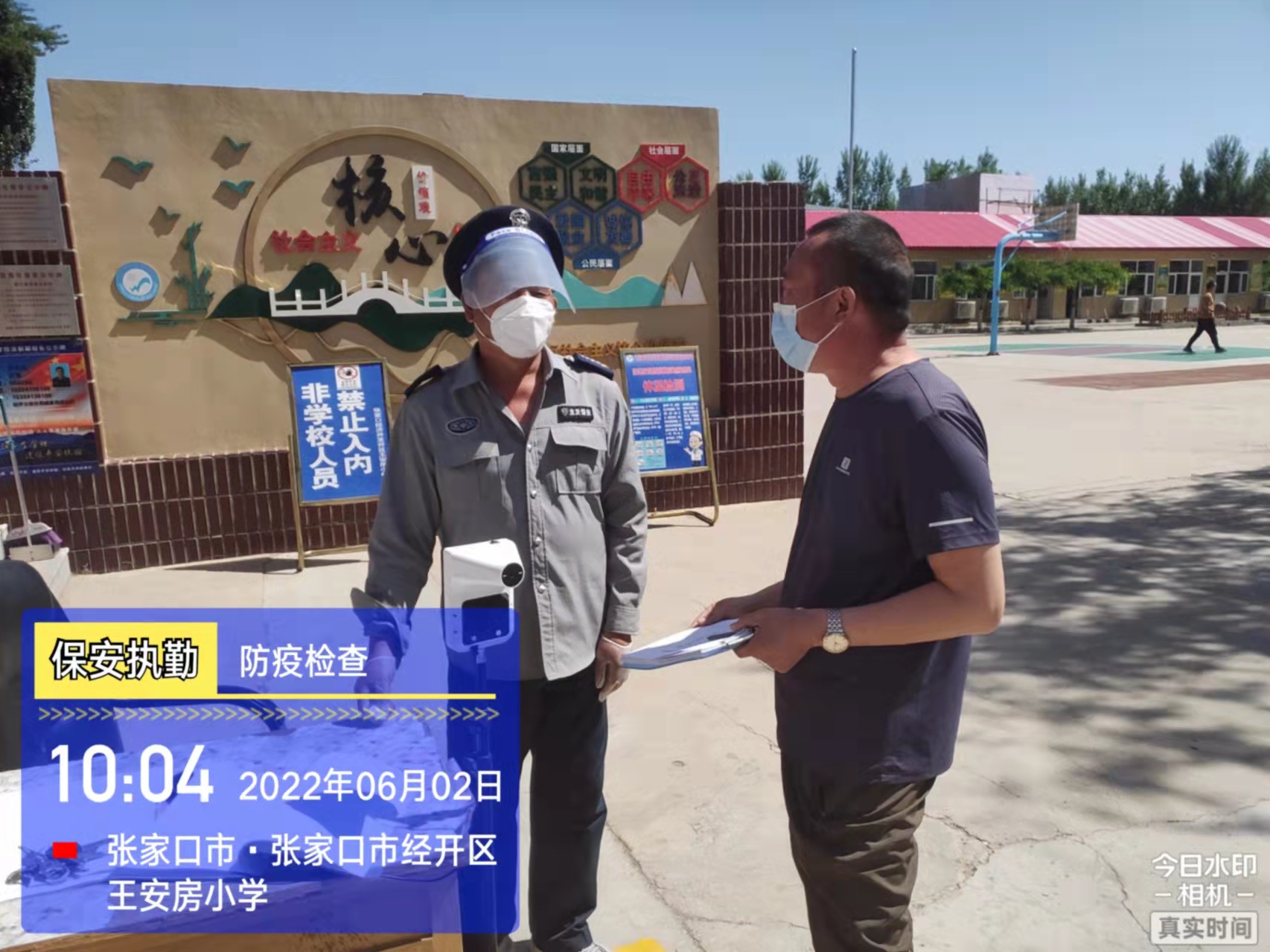 會后,我公司迅速召開“疫情期間學校門衛(wèi)安全防控工作要求”的會議,制定了校園安全防疫規(guī)定:疫情防控期間,校園保安隊員必須穿制服,規(guī)范佩戴“三件套”(防護隔離面罩、N95口罩、一次性PVC手套);進出校園的師生必須測量體溫,外來人員需登記、測溫、掃碼(幸福張家口,呈綠碼)、且持7日內核酸陰性檢測結果;保安室需保持干凈整潔,物品擺放有序,勤開窗通風,定期噴灑消毒藥水。為此,公司特成立校園防疫檢查小組,由副經理帶隊,協同主管大隊長對經開區(qū)所有中小學校安保崗位進行防疫工作檢查,檢查期間,發(fā)現問題,現場處理,并及時與校方領導溝通,杜絕同樣問題再次出現,確保校園防疫安保工作萬無一失,為各校師生鑄就一道安全防線!